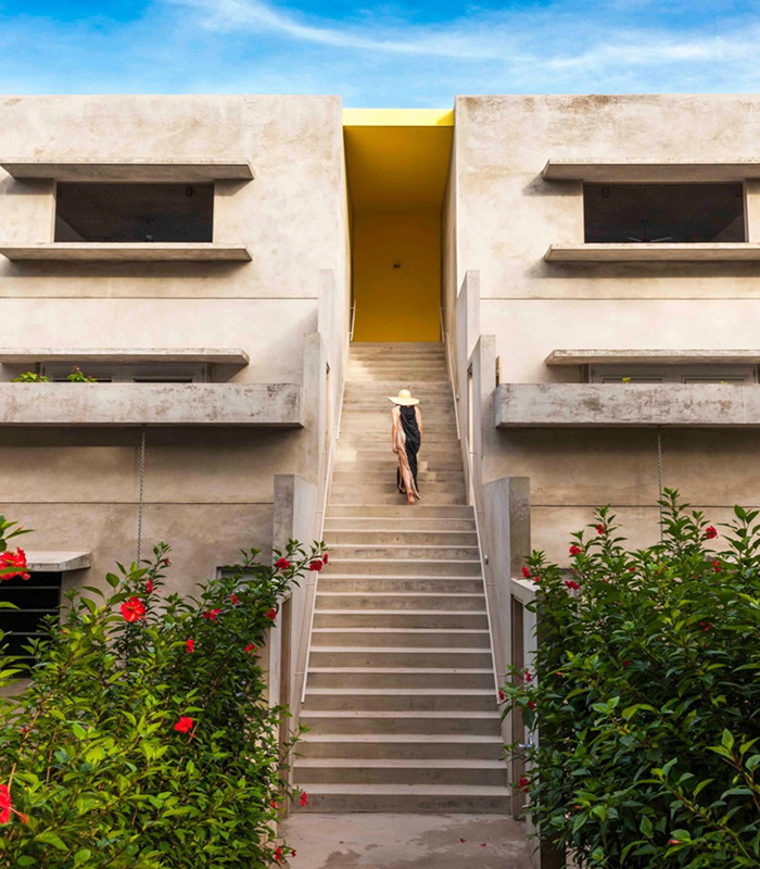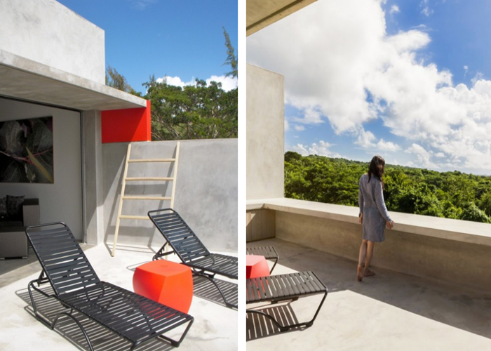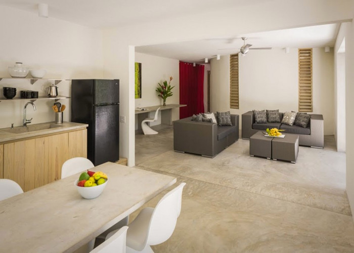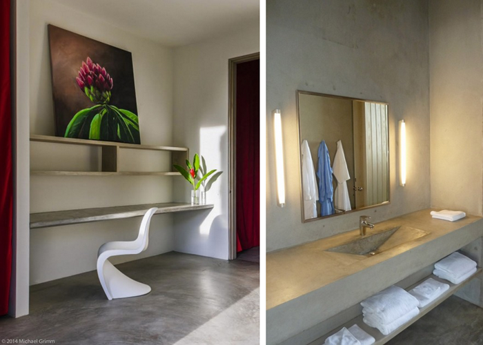 在平面上,建筑朝向有利于加勒比海信風聚集并穿堂而過,省去了安裝空調設備的需求。房間使用LED照明燈,節能吊頂風扇和其他設施以減少其總體能耗。光伏面板和電池為酒店提供了電力支持,顧客能為ipad和電腦充電。熱水板可加熱雨水用于露天淋浴,而洗盥污水直接灌溉了花園。